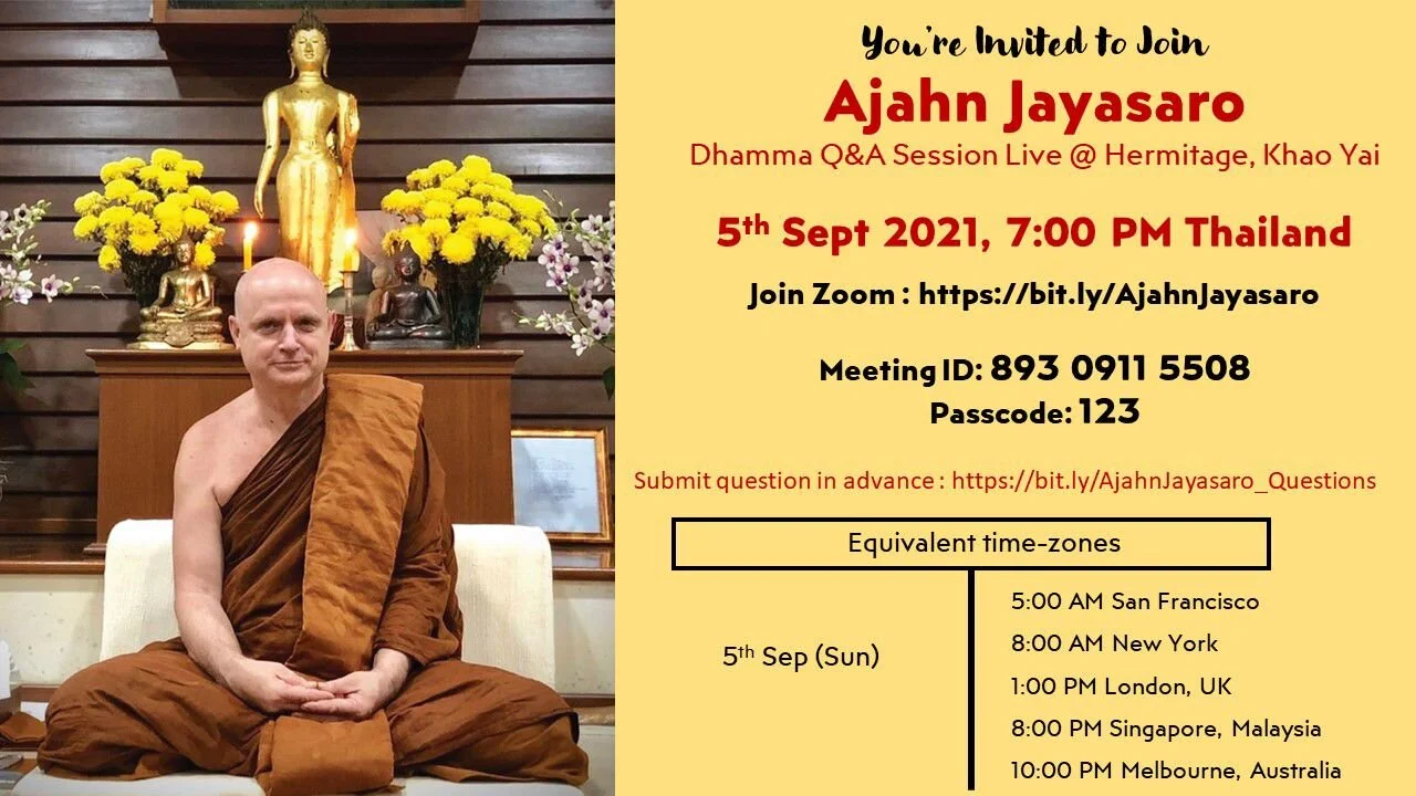 Ajahn Jayasaro Dhamma Talk-Recommended Zoom Sunday, September 5, 2021 8:00 PM 9:00 PM 20:00 21:00 Google Calendar ICS Join Zoom: https://bit.ly/AjahnJayasaroMeeting ID: 893 0911 5508Password: 123