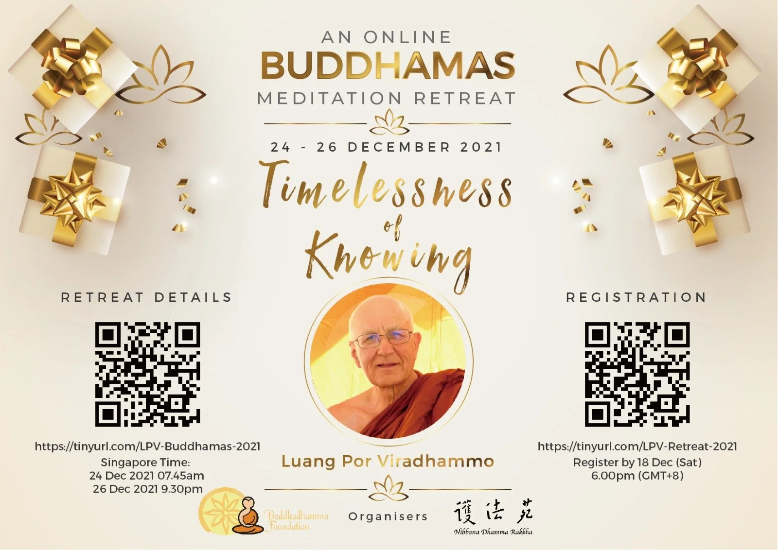 Luang Por Viradhammo - An Online BUDDHAMAS Meditation Retreat Friday, December 24, 2021 6:00 AM 06:00 Sunday, December 26, 2021 9:30 PM 21:30 Google Calendar ICS Below is online Registration before 18 Dec 2021: https://tinyurl.com/LPV-Retreat-2021Retreat Detailshttps://tinyurl.com/LPV-Buddhamas-2021