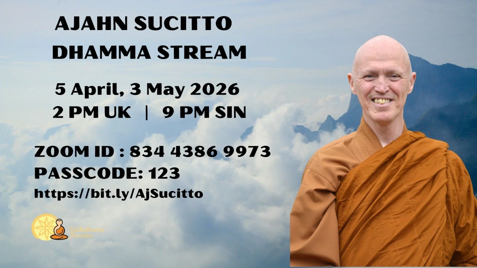 2026 Dhamma Stream by Ajahn Sucitto Sunday, April 5, 2026 9:00 PM 10:00 PM 21:00 22:00 Zoom (map) Google Calendar ICS Ajahn Sucitto - Guiding Elder, Cittaviveka, Chithurst Buddhist MonasteryZoom Meeting ID: 834 4386 9973passcode: 123Https://bit.ly/AjSucitto